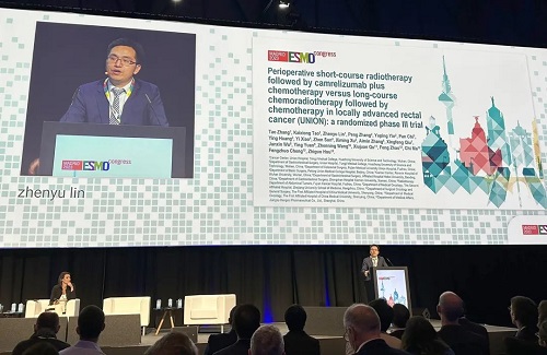 10月21日,利来国际真人娱乐医药创新药卡瑞利珠单抗(艾瑞卡®)的一项研究“新辅助短程放疗序贯卡瑞利珠单抗联合化疗对比长程放化疗序贯化疗治疗局部晚期直肠癌”随机对照Ⅲ期试验(UNION) 以优选口头报告的形式正式亮相。该研究由华中科技大学同济医学院附属协和医院张涛教授、陶凯雄教授担任主要研究者,华中科技大学同济医学院附属协和医院林振宇教授在马德里现场报告了该重磅研究的结果1,此项研究是全球首个评估短程放疗序贯免疫治疗联合化疗治疗局部晚期直肠癌的Ⅲ期研究,已达到主要终点病理完全缓解(pCR),有望为直肠癌患者的治疗提供新策略。
